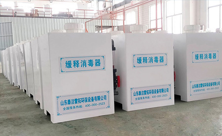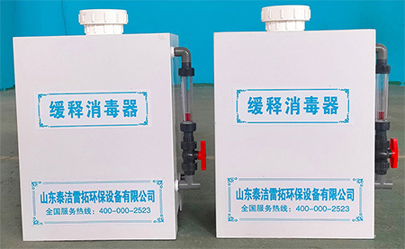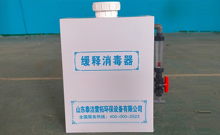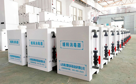 緩釋消毒器采用自動緩釋延時壓力加氯工藝,以含量90%以上的強氯固體藥劑為主要原料,水與藥劑合理混合后所產(chǎn)生的消毒殺菌液,投加到水池、水井、管道和污水池等,并與之接觸達到滅菌的作用。