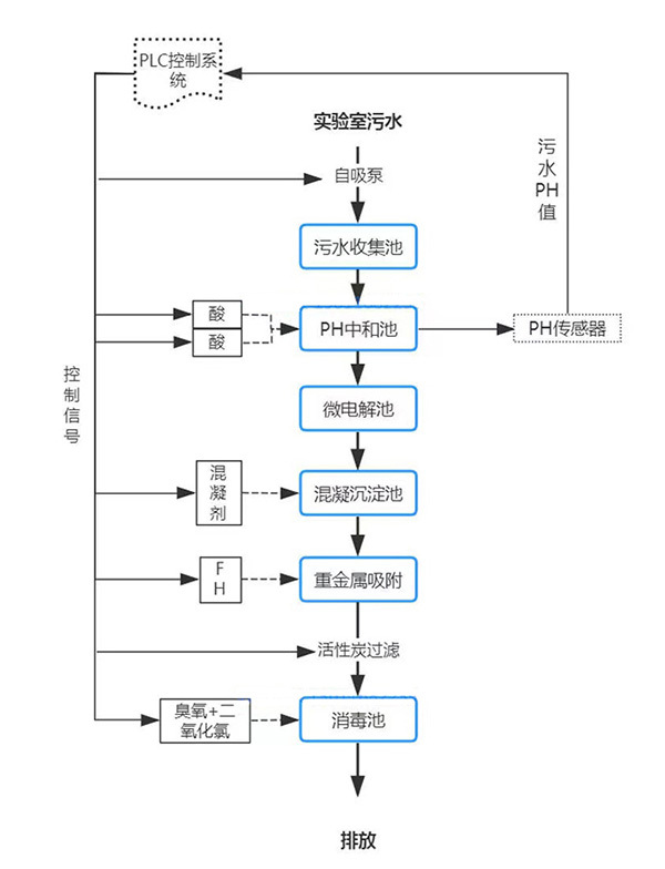 有污水收集裝置、中和調(diào)節(jié)裝置、加藥反應(yīng)裝置、過濾裝置、生物活性炭氧化裝置、消毒裝置等構(gòu)成。通過以上工藝對(duì)實(shí)驗(yàn)室內(nèi)產(chǎn)生的有機(jī)、無機(jī)、生物廢水進(jìn)行綜合處理,可有效去除廢水中的COD、BOD、SS、色度和重金屬離子等,針對(duì)不同實(shí)驗(yàn)廢水的組成成分,采用不同的處理技術(shù)及控制系統(tǒng)進(jìn)行廢水處理。產(chǎn)品具有技術(shù)先進(jìn)、自動(dòng)化程度高、無需專人職守、處理效果好、占地面積小、操作管理方便等優(yōu)點(diǎn)。